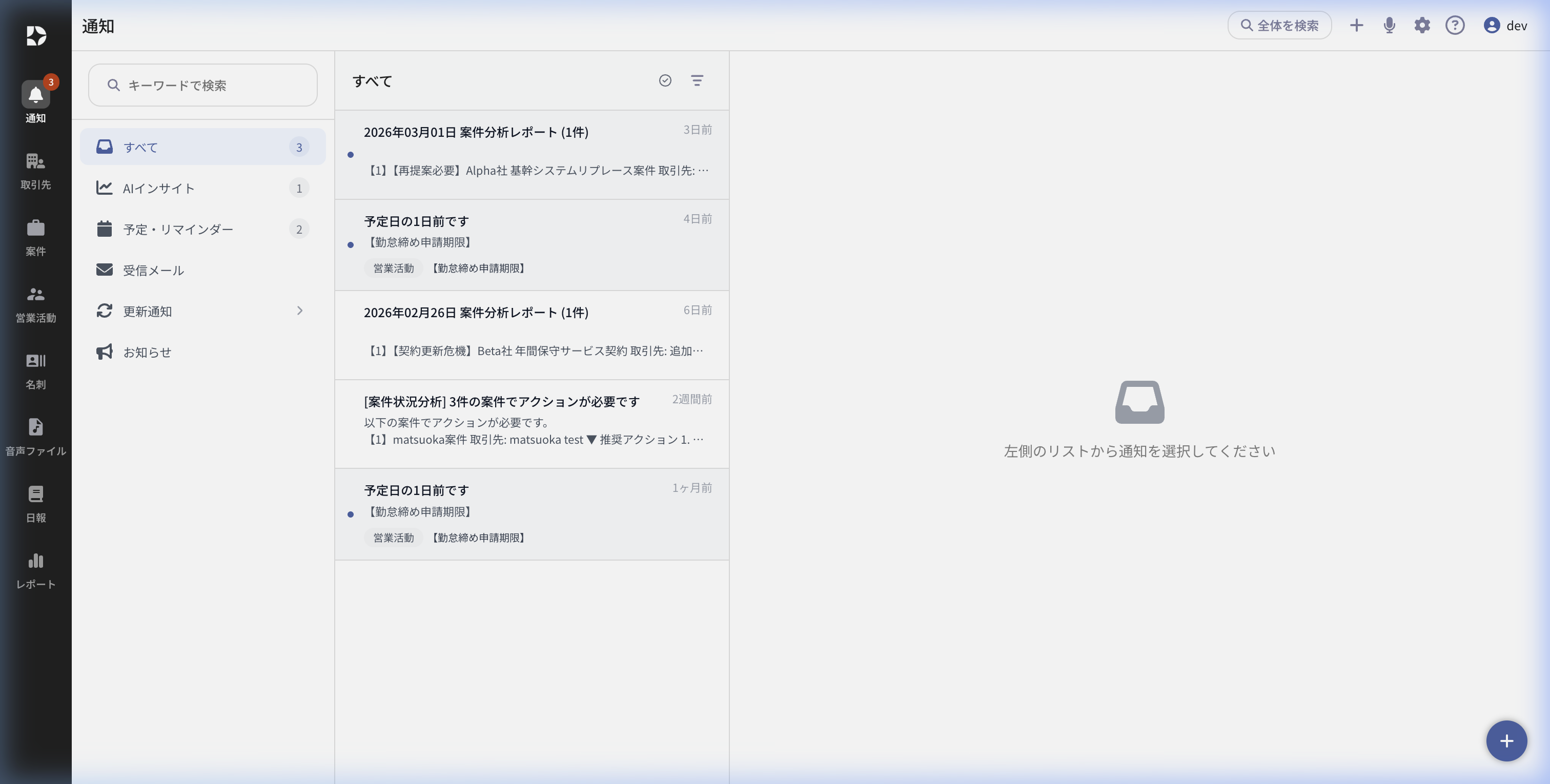 DRIVE SFA に届く各種通知・メールを一元管理する画面です。左サイドバーの 「通知」 からアクセスします。